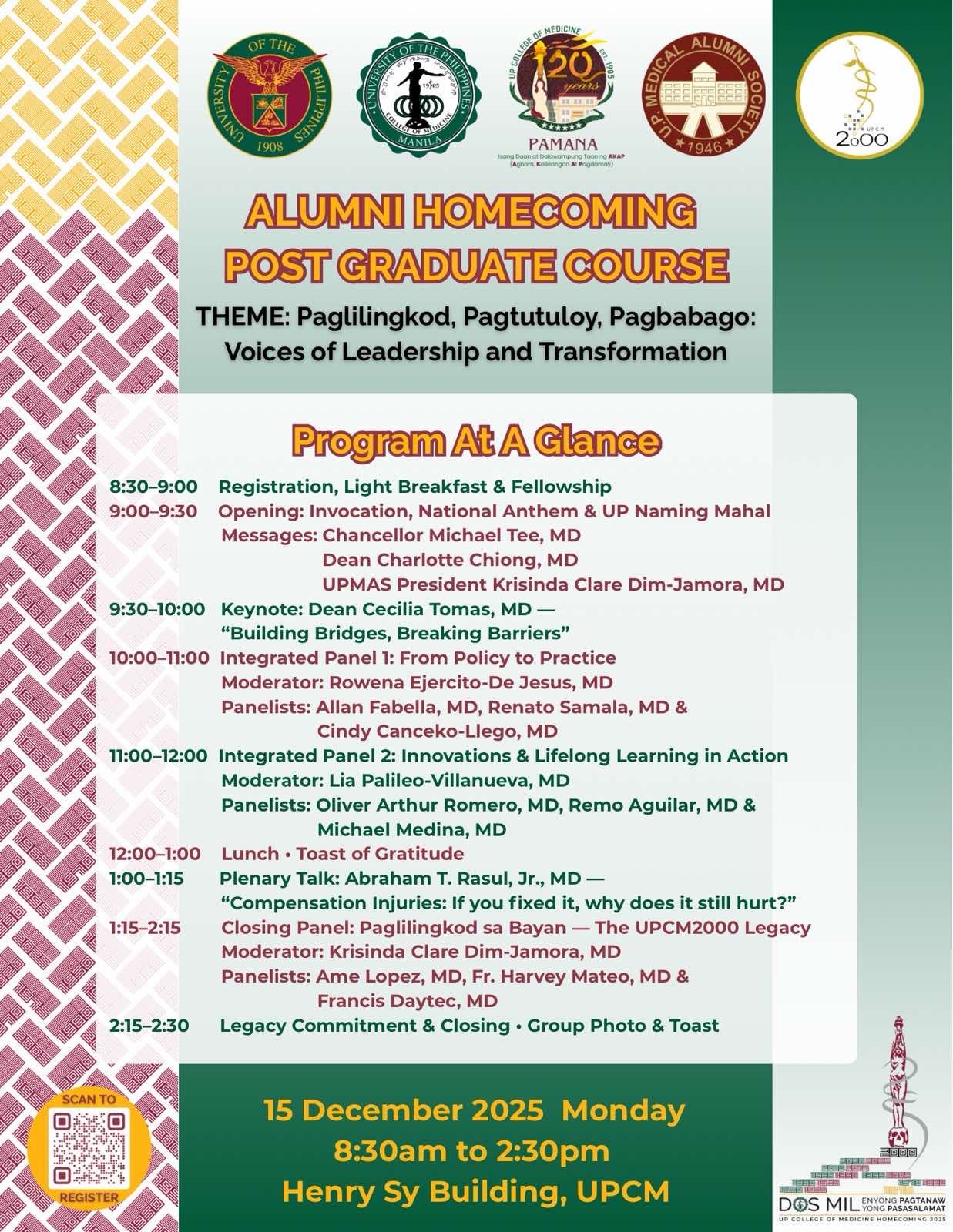 The UPCM Silver Jubilarian Class 2000 invite you to the 2025 Alumni Homecoming Postgraduate Course with the theme “Paglilingkod, Pagtutuloy, Pagbabago: Voices of Leadership and Transformation”