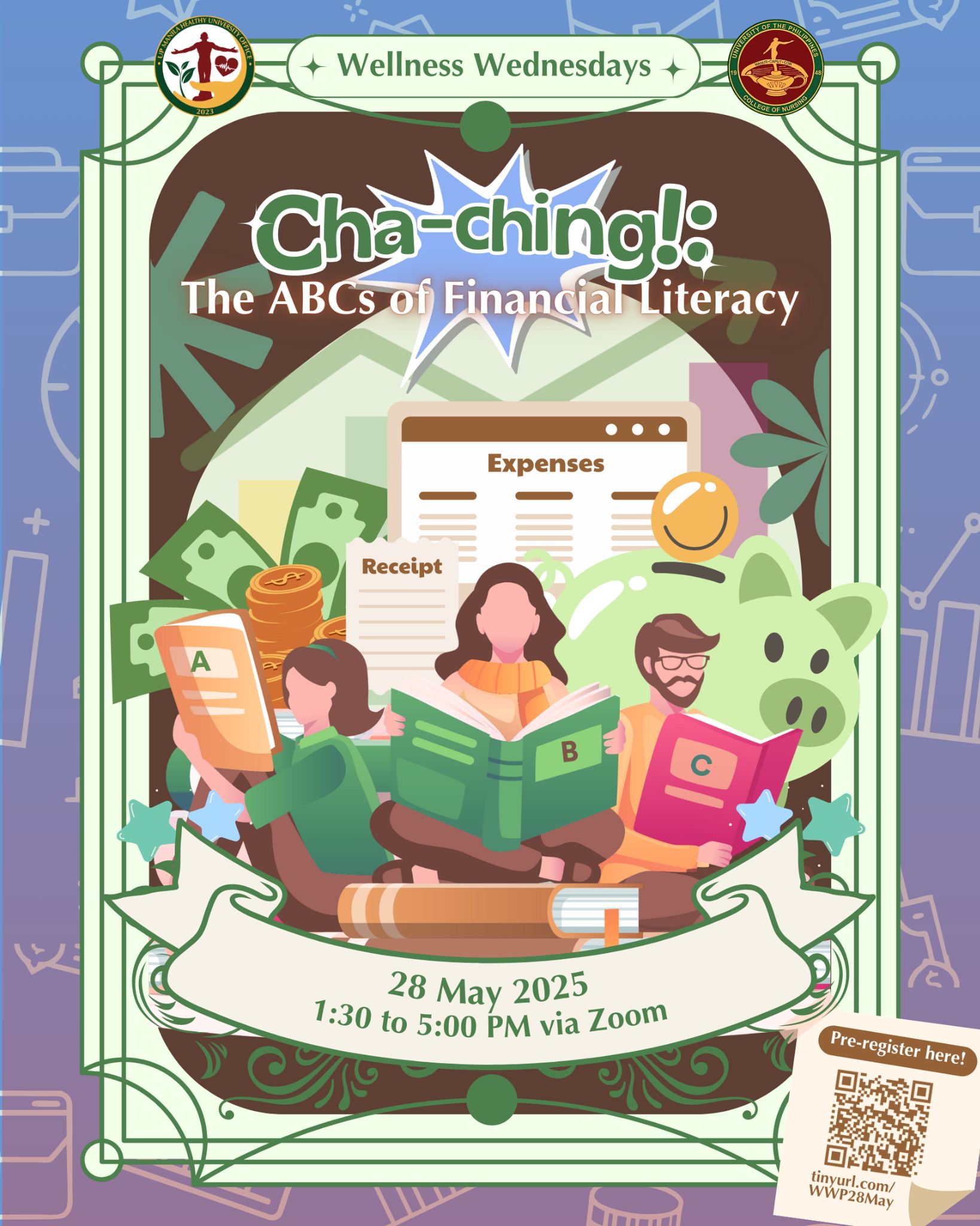 We are pleased to invite you to our Wellness Wednesday Project event titled, “Cha-ching!: The ABCs of Financial Literacy” on 28 May 2025 from 2:00 to 5:00 PM via Zoom (online), hosted by the UP Manila Healthy University Office and the College of Nursing.
