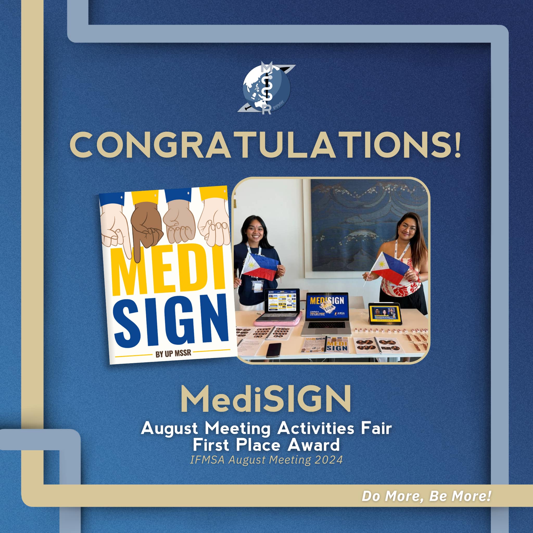 Congratulations to MediSIGN, an MSSR project, for winning First Place in the recently concluded August Meeting Activities Fair in Tampere, Finland! Among 140 NMOs from 129 countries all over the world, MediSIGN was internationally recognized as the top activity!
