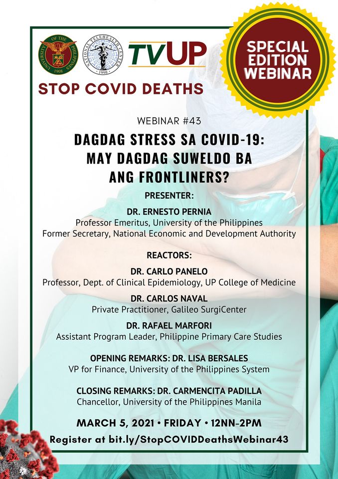 Filipino health frontliners have been hailed as heroes during this pandemic, but will they ever be given just compensation for their service? Dagdag suweldo for the frontliners will be discussed in a UP “Stop COVID Deaths” webinar set on Friday, March 5, 12:00 noon.
