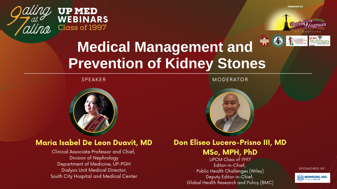 Join us again next week! See you on Monday, October 10, at 12 noon Manila time. Our speaker Dr. Maria Isabel Duavit will present a webinar on Medical Management and Prevention of Kidney Stones.