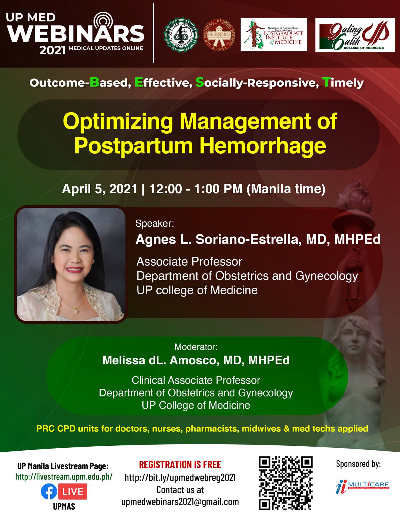 We will be joined by Dr. Agnes L. Soriano-Estrella who will give the webinar titled "Optimizing Management of Postpartum Hemorrhage".