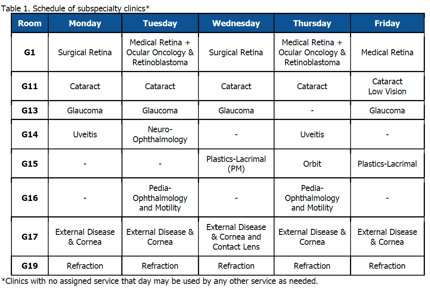 The clinic offers its services to all patients needing ophthalmologic consults. Patients may be new consults, referrals from other departments; patients needing subspecialty care, or follow up patients. The General Clinic is at the ground floor of the SOJR. Three (3) Refraction rooms are also located at the ground floor of the room.